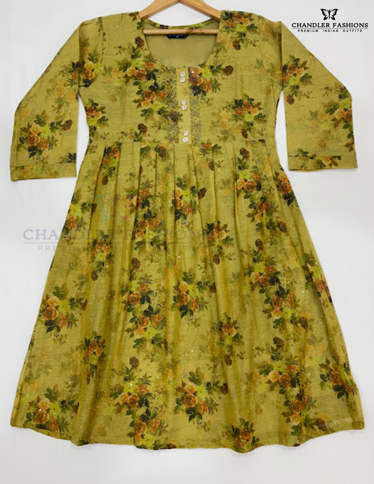 Alluring Green Color Tissue Silk With Floral Design Kurti For Girls