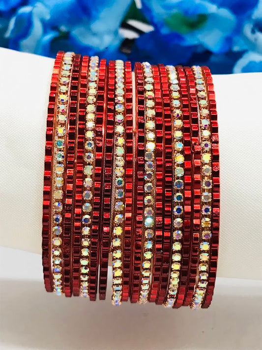 Dazzling Red Color Stone Worked Party Wear Metal Bangles For Women