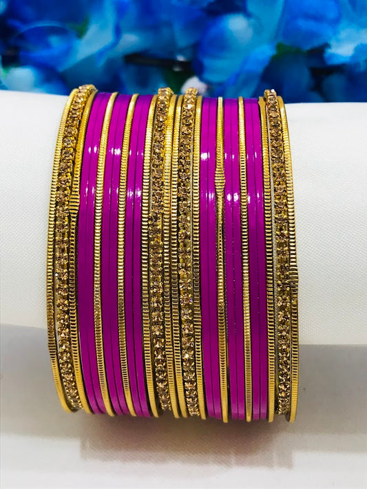 Stunning Rani Pink Color Stone Worked Metal Bangles For Women