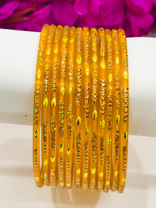 Beautiful Mustard Yellow Color Checked Design Glass Bangles For Women