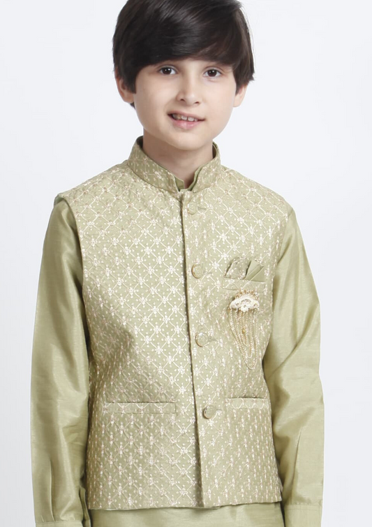 Alluring Light Green Color Silk Cotton Kid's Kurta With Embroidery Jacket And Pant