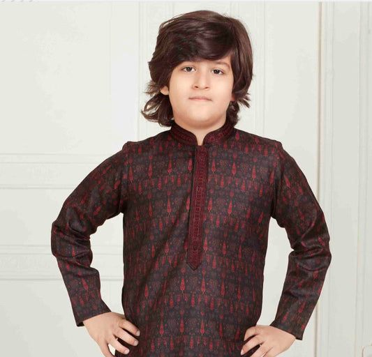 Beautiful Maroon Colored Poly Cotton Kurta With Pajama Set For Kids