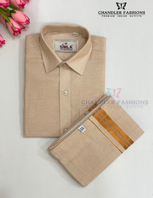Beautiful Sandal Color Cotton Shirt With Tissue Zari Work Dhoti Set For Kids