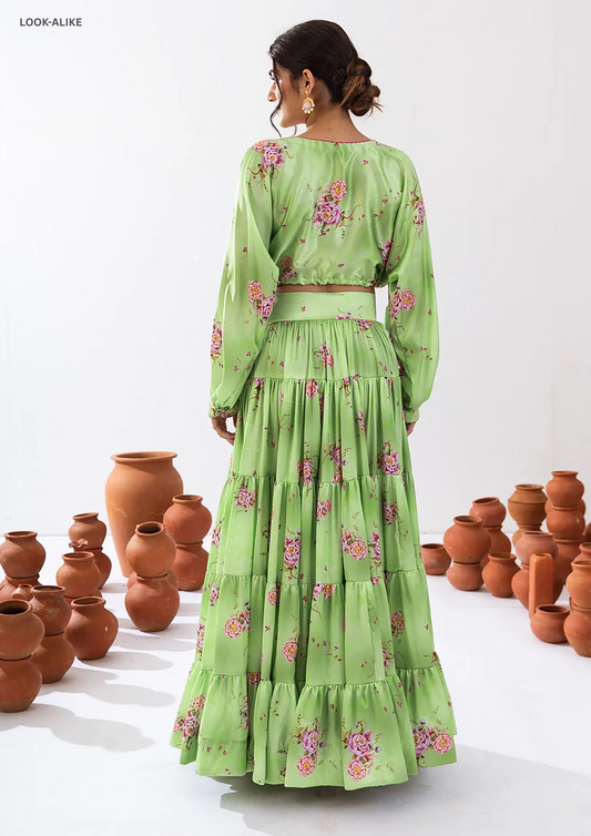 Dazzling Green Color Floral Printed Tier Lehenga With Crop Top