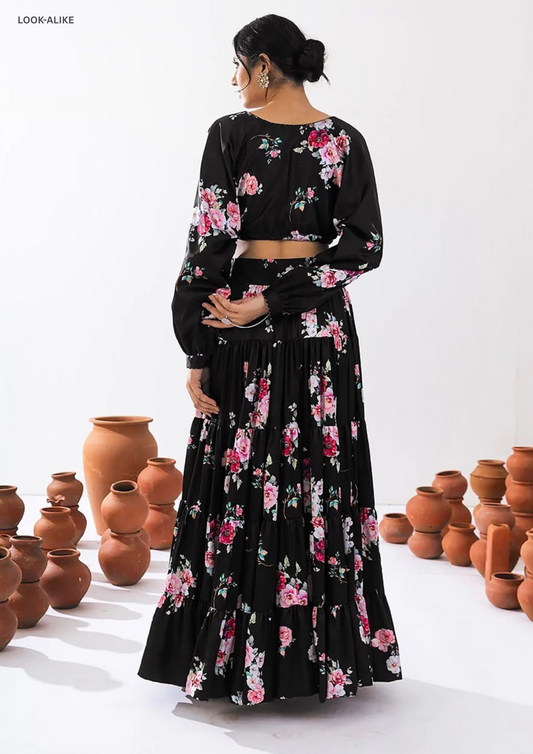Appealing Black Color Floral Printed Tier Lehenga With Crop Top