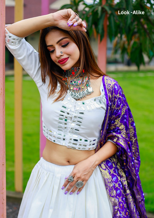 Stunning White Color Cotton Lehenga Set With Purple Color Dupatta For Women