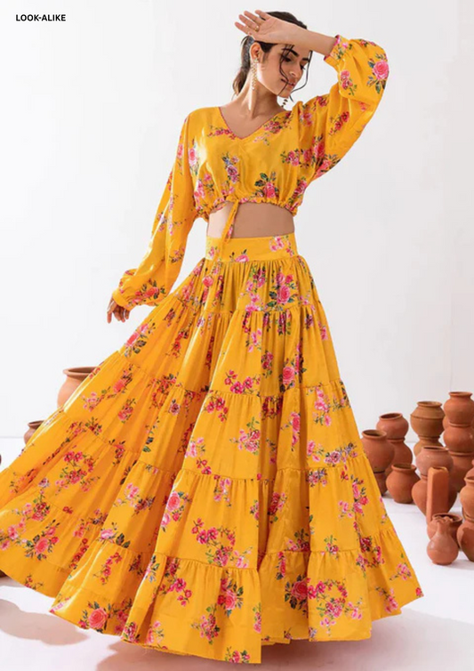 Beautiful Yellow Color Floral Printed Tier Lehenga With Crop Top