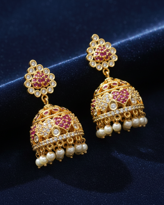 Beautiful Dark Pink And White Stones Gold Plated Jhumkas