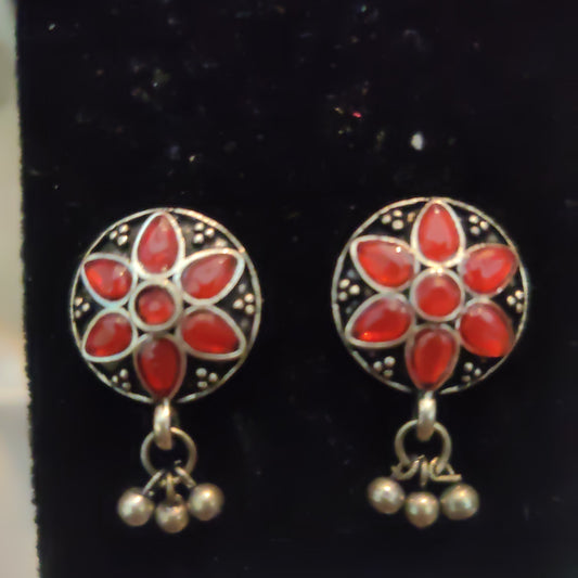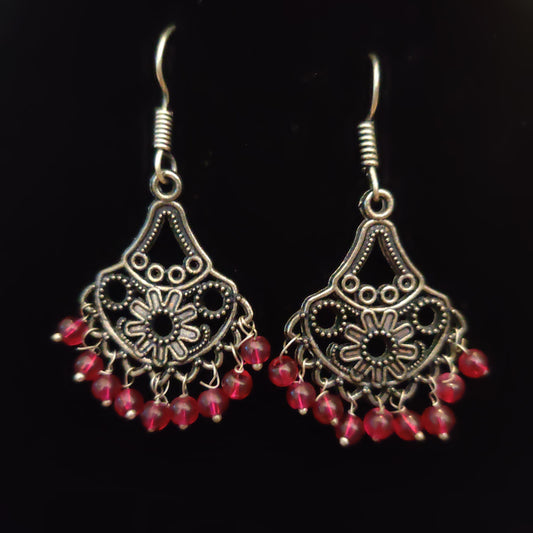 Beautiful Maroon Color Stoned Silver Oxidized Jhumka Earrings With Drops
