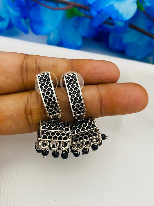 Marvelous Oxidized Silver Plated Jhumka Earrings With Beads