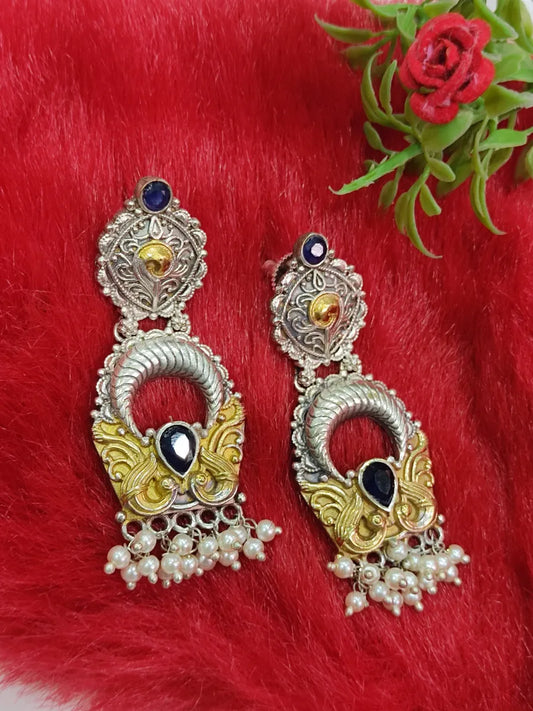 Gorgeous Blue Stone Antique Design Pearl Beaded Oxidized Earrings