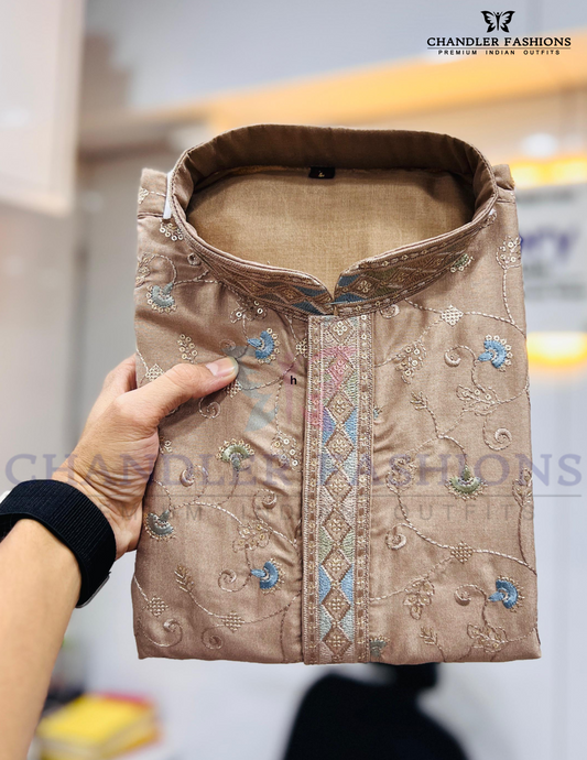 Appealing Brown Color Silk Kurta Suit With Embroidery Flower Work For Men