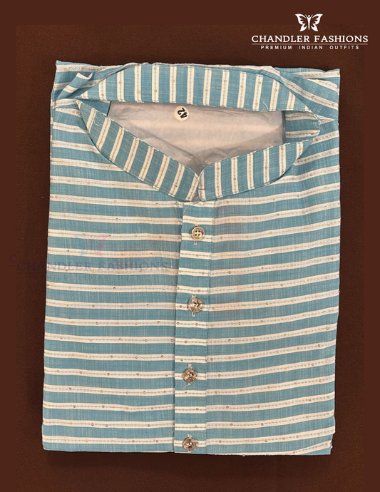 Amazing Sky Blue And White Color Cotton Kurta With Pajama For Men