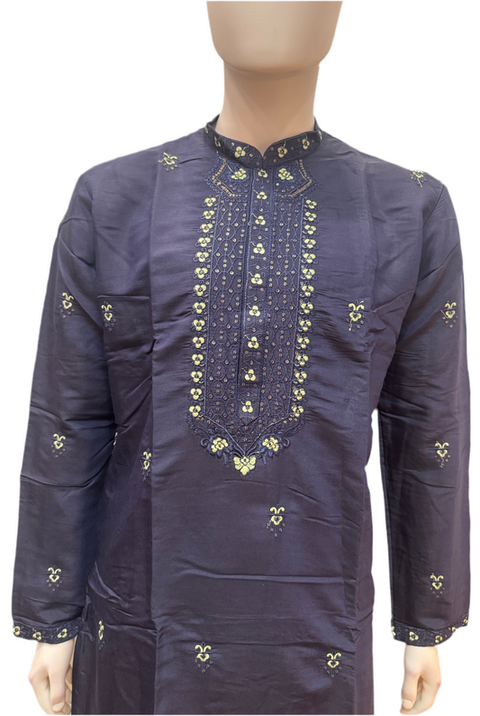 Delightful Dark Blue Color With Cotton Embroidery Work Kurta Suits For Men
