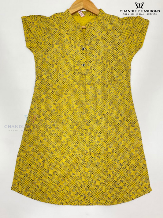 Elegant Mustard Yellow Color Cotton Kurti With Printed Work For Girls
