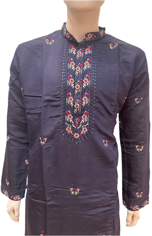 Elegant Navy Blue Color Cotton Embroidery Work Kurta Suits For Men