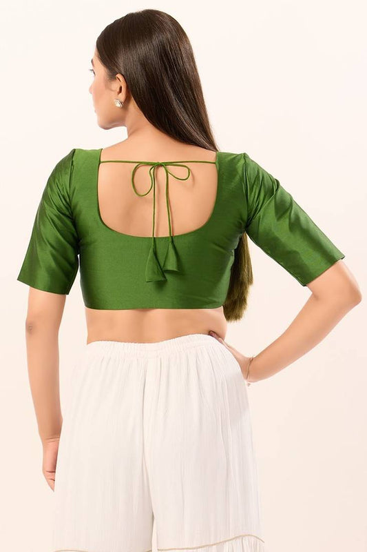 Gorgeous Mehendi Green Color Silk Blend Fabric Round Neck Readymade Blouse For Women