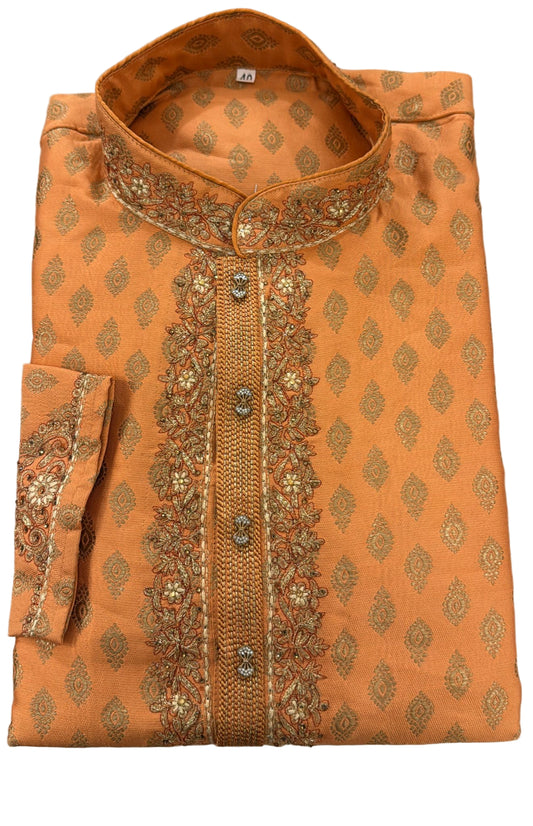 Wonderful Orange Color Raw Silk Designer Men's Kurta With Stone And Embroidery Work