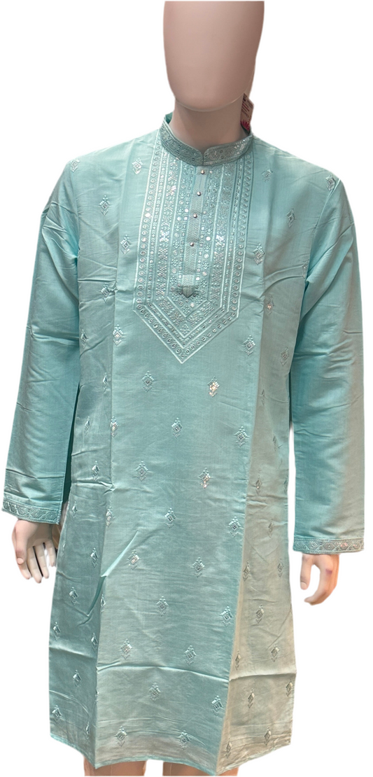 Alluring Teal Green Color Cotton Embroidered Kurta With Pajama For Men
