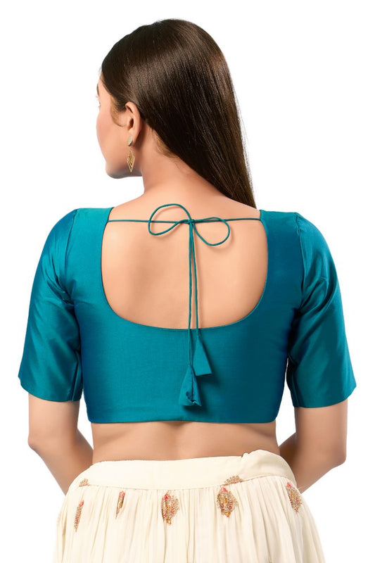 Alluring Teal Blue Color Silk Blend Fabric Round Neck Readymade Blouse For Women