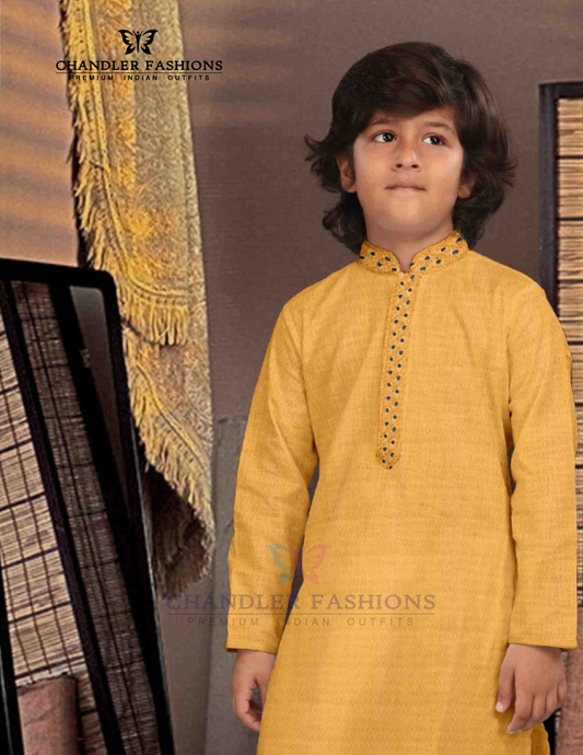 Wonderful Yellow Color Poly Cotton Kurta Pajama Set For Kids