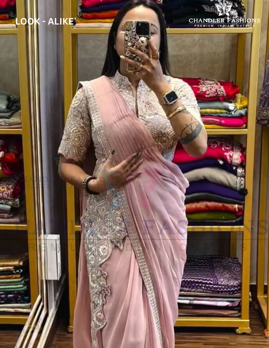 Stunning Light Pink Color Ready To Wear Chinon Embroidery Saree For Women