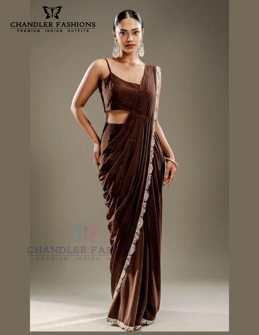 Gorgeous Brown Color Heavy Chinon Ready To Wear Saree For Women