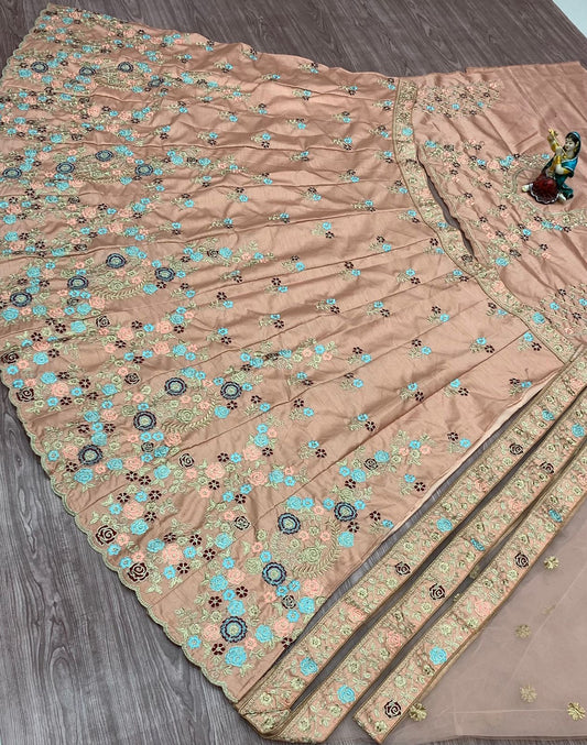 Fancy Floral Heavy Embroidered Peach Color Malay Satin Lehenga For Women