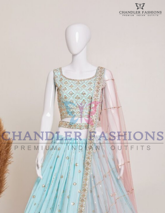Attractive Sky Blue Color Georgette Embroidery Sequins Work Lehenga For Women
