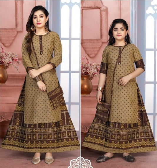 Like Mom Like Daughter Brown Stylish Printed Rayon Kurti With Skirt & Purse