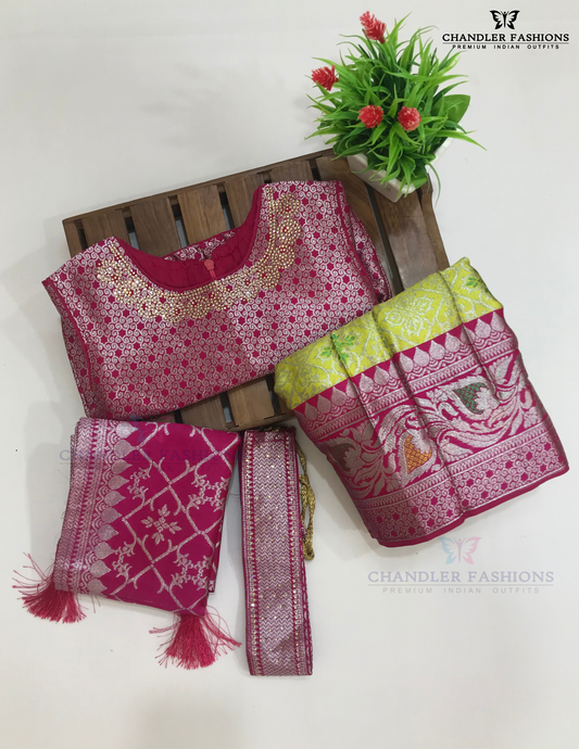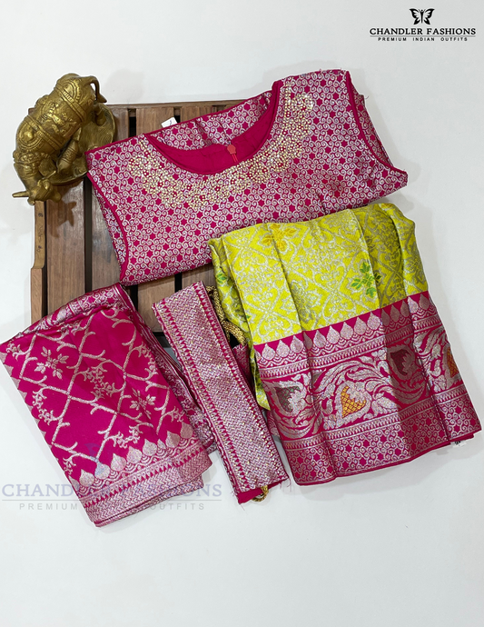 Charming Pink And Light Green Colored Silk Choli Sets With Stone Work For Girls