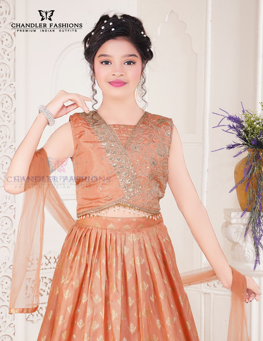 Attractive Orange Color Chanderi Cotton Embroidery Work Choli Set For Girls