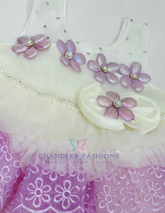Alluring Off White And Lavender Color Soft Net Frock For Girls