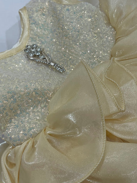 Pretty Sandal Color Sequins Work Frock With Brooch Pin For Girls