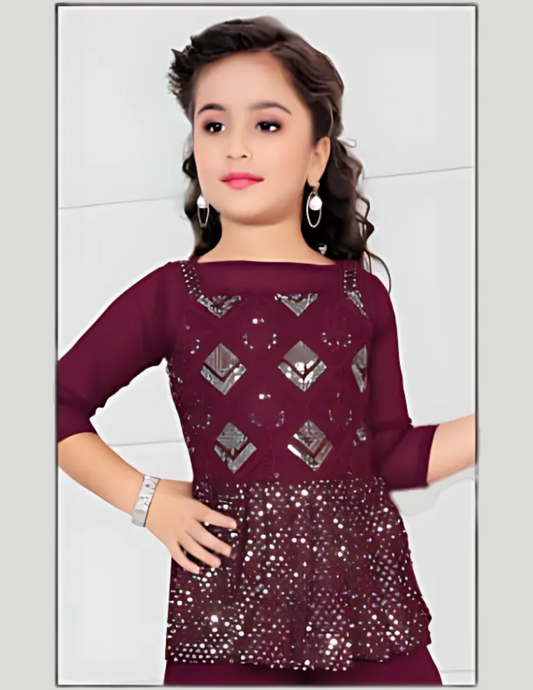 Attractive Wine Color Georgette Sequins Work Sharara Suit For Girls
