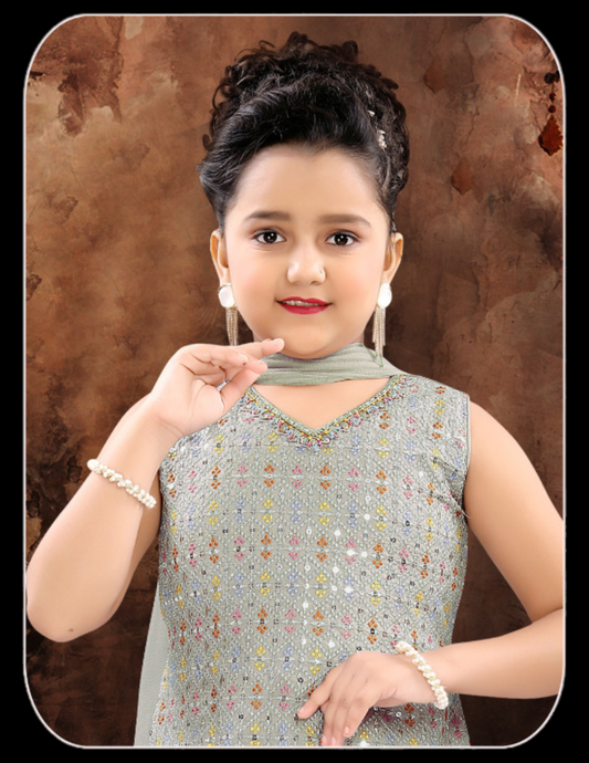 Elegant Gray Color Georgette Embroidery Work Sharara Suit For Girls
