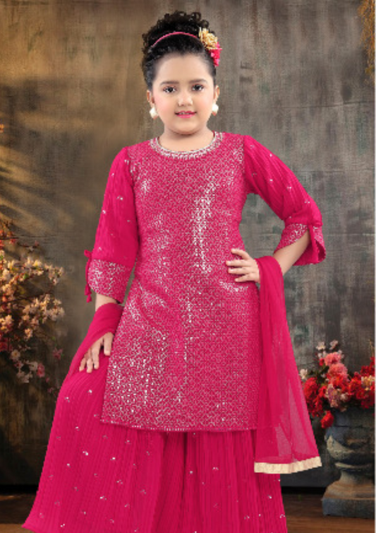 Elegant Rani Pink Color Georgette Embroidery Work Sharara Suit For Girls