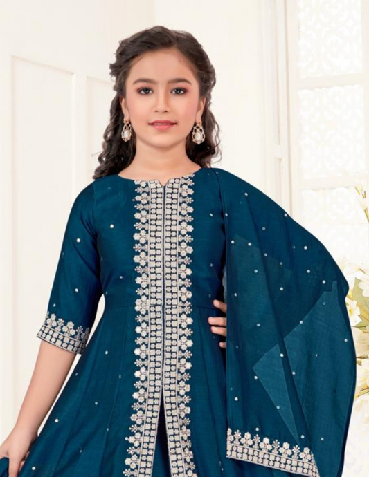 Elegant Teal Blue Color Satin Embroidery Work Kurti Suits With Dupatta Set For Girls