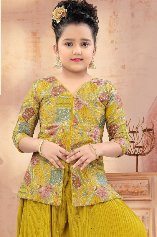 Charming Yellow Colored Embroidery Coat With Palazzo Pant Set For Kids