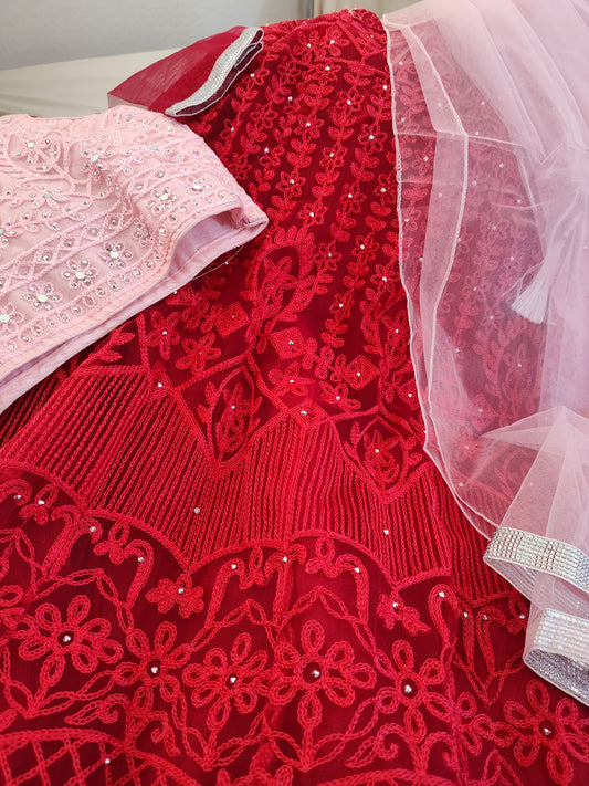 Gorgeous Baby Pink And Bright Red Lehenga Choli Set