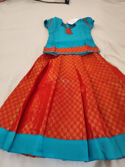 Fabulous Sky Blue And Red Color Designer Silk Langa Set For Kids
