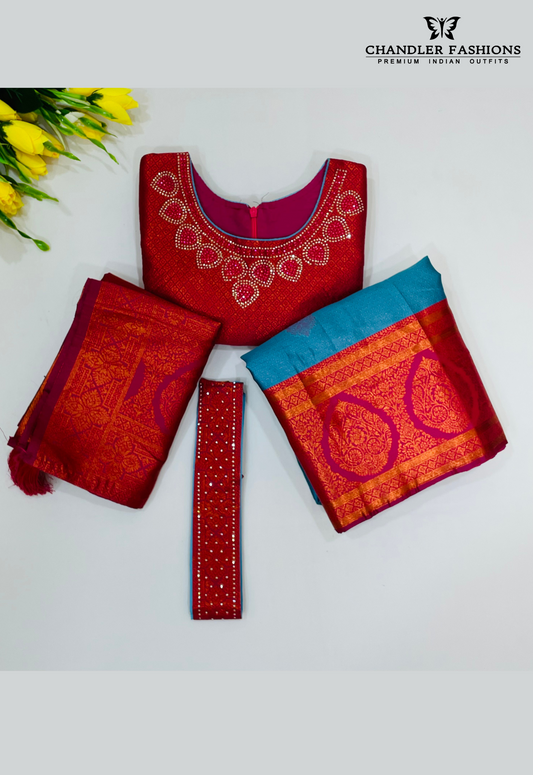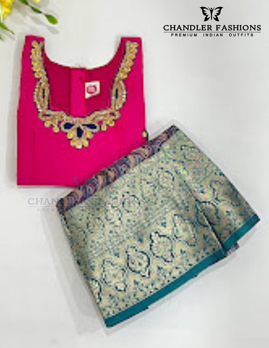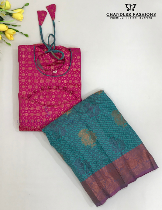 Pretty Green And Pink Colored Silk Choli Sets With Zari Work For Girls