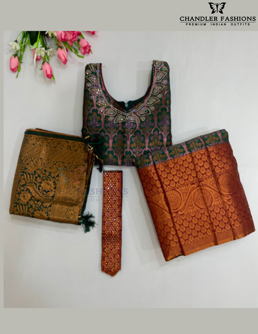 Attractive Dark Green Colored Silk Choli Sets With Stone Work For Girls
