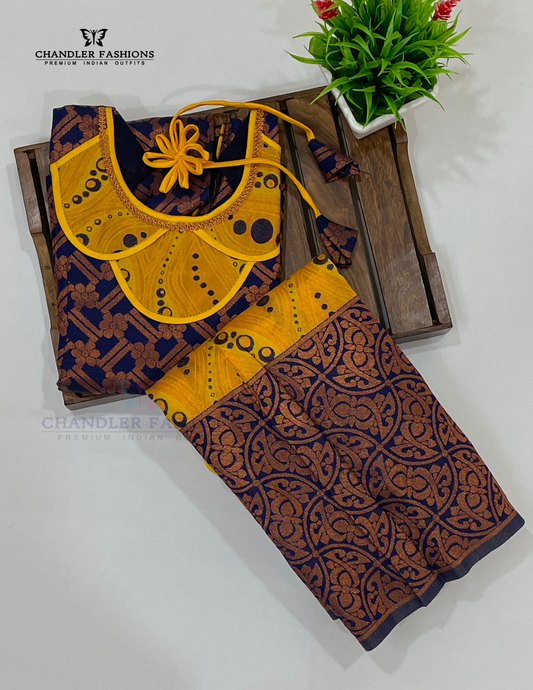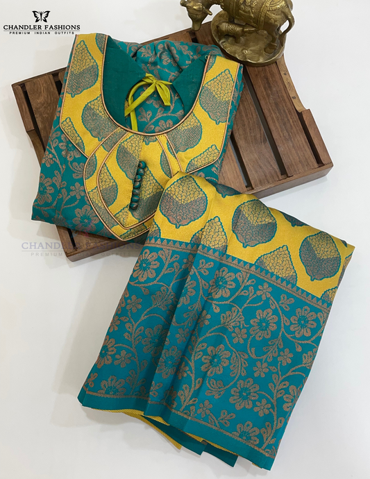 Charming Rama Green And Yellow Color Silk Langa Set With Zari Work For Girls