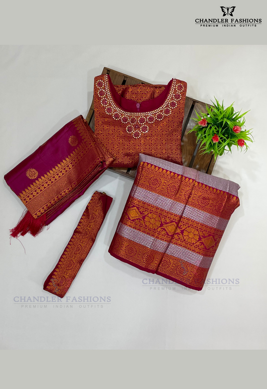 Wonderful Dark Maroon Colored Art Silk Half Saree Sets For Girls