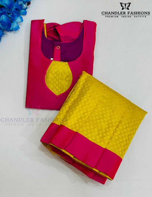Pleasing Pink And Yellow Colored Silk Langa Sets With Stone Work For Girls