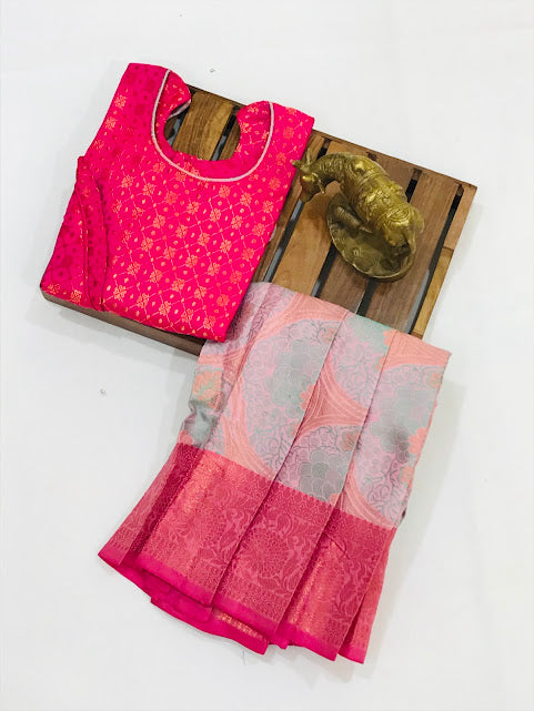 Delightful Pink Colored Sleeveless Silk Langa Sets For Girls