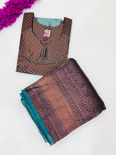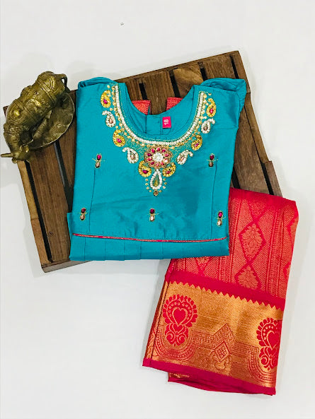 Alluring Teal Blue Colored Silk Langa Sets For Girls