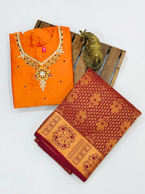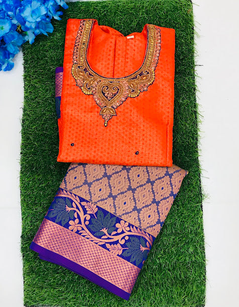 Attractive Orange Colored Silk Embroidery Work Langa Sets For Girls
