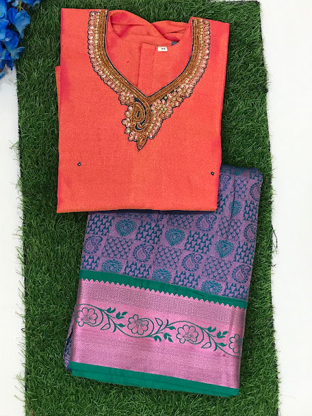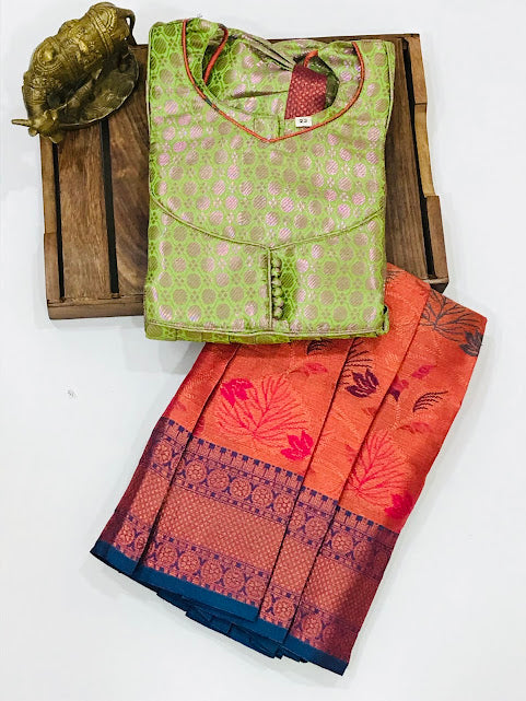 Elegant Orange Colored Silk Embroidery Work Langa Sets For Girls